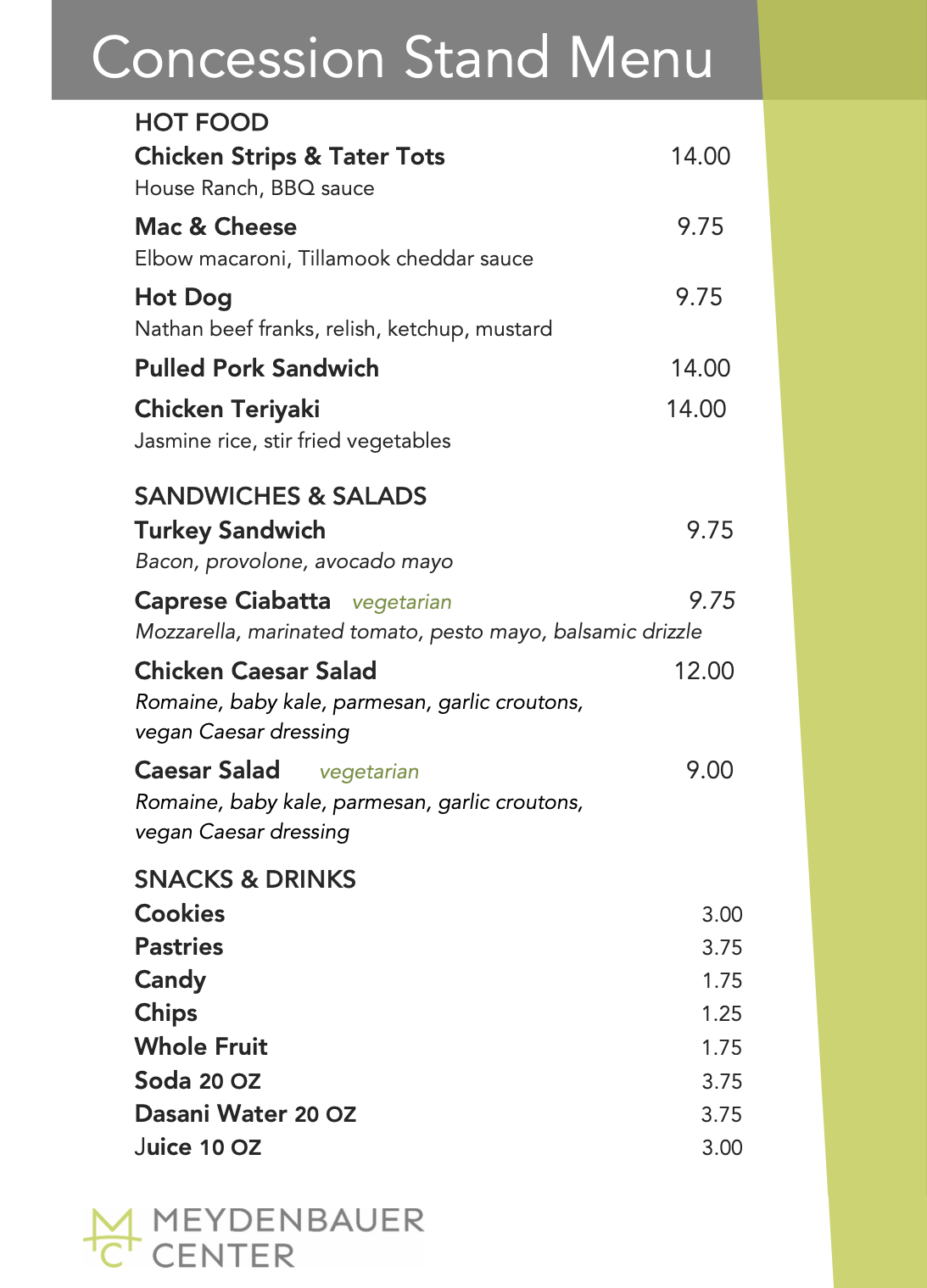 Meydenbauer will be selling hot concessions on Saturday and Sunday and the Latte Cart will be back and will have sandwiches in addition to coffee. You can view the concessions menu for more details.